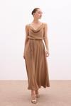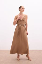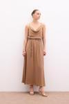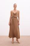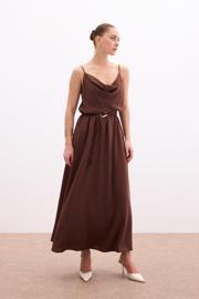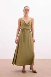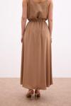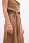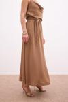 Yüksek bel, arka fermuarlı, gold kemerli uzun etek.