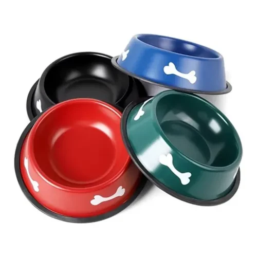 Görseldeki Kemik Motifli Metal Mama Kapları, iç kısmı paslanmaz çelikten üretilmiş olup, dış kısmında canlı renkli plastik kaplama ile şık bir görünüm sunar.