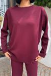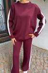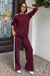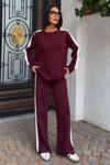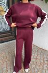 - Zarif bordo rengiyle dikkat çeken bu rahat triko takım, günlük kullanım için idealdir.; - Sade ve şık tasarımıyla her ortama uyum sağlayan düz desenli yapısı, kolay kombinleme imkanı sunar.; - Regular kalıp sayesinde vücut hatlarınıza uygun bir oturuş sağlar ve konforlu bir deneyim yaşatır.; - Kadın ve kız kullanıcılar için özel olarak tasarlanmıştır; herkes tarafından rahatlıkla tercih edilebilir.; - Dokuma kumaşı sayesinde dayanıklılığı artırırken, pamuklu materyali cildinizle dosttur.; - Normal boy kesimi ile farklı boylardaki kullanıcıların rahatça giyebileceği standart bir yapıya sahiptir.; - Casual koleksiyonun parçası olan bu takım, günlük şıklığınızı tamamlamanız için mükemmeldir.; - İki parçadan oluşan set içeriği (kazak-pantolon) ile hem pratiklik hem de stil sahibi görünüm kazandırır.; - Her mevsime uygun olmasıyla yıl boyunca gardrobunuzda yerini alacak zamansız bir parça.