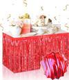 Canlı kırmızı tonuyla partinize enerji ve şıklık katın 75 x 275 cm ölçülerindeki kendinden yapışkanlı kırmızı metalize püsküllü masa eteği, doğum günü, yılbaşı, sevgililer günü, mezuniyet, nişan ve tüm kutlamalarda masa dekorasyonunuzu tamamlar.