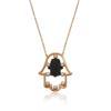 Hz. Fatma'nın eli olarak bilinse de arapçada “hamse” diye anılır. Hamse, beş anlamına gelir ve bir elin parmak sayısını gösterir. Hz. Fatma bir gün mutfakta helva kavururken, eşi Hz. Ali görür ve pişen helvaya elini daldırır ancak hiç bir şey olmaz, helvayı böyle kavurmayı devam eder. O günden sonra elinin kutsallığına, gücüne adeta yenilmezliğine inanılır. Her güçlük adeta onun eliyle aşılacaktır. Bu harika tasarım Fatma eli bayan kolye modeli 925 ayar gümüş ile imal edilmiştir. Gümüş üzerine rose altın kaplama yapılmıştır. Rose altın kaplama yapılan gümüş bayan kolye modelleri parlaklığını uzun süre muhafaza eder. Kolye üzerinde bulunan siyah ve beyaz taşlar zirkondur. Gümüş Fatma eli bayan kolye modelinde olduğu gibi tüm gümüş bayan kolye modelleri el emeği ile üretilmiştir. Gümüş ve değerli taşlar nedeniyle belirtilen ortalama ürün ağırlığında ± %10 sapma olabilmektedir.