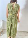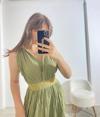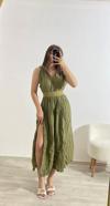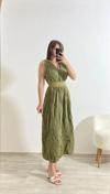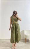 Şıklığın ve konforun buluştuğu bu yeşil yazlık elbise, doğal dokusu ve modern tasarımıyla dikkat çekiyor. Hafif kırışık görünümlü kumaşı, keten hissi vererek hem yaz sıcaklarında rahatlık sağlar hem de stil sahibi bir duruş sunar. Bel kısmındaki etnik desenli lastikli kemer detayı, vücut hatlarını zarifçe ortaya çıkarırken elbiseye hareket katıyor. Yan yırtmaç detayı ise hem feminen bir hava kazandırır hem de yürürken ekstra rahatlık sunar.