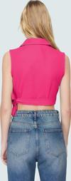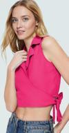 Bu şık crop bluz, benzersiz tarzınızı yansıtırken rahatlığınızdan da ödün vermemenizi sağlar. Keten görünümlü dokuma kumaş, yaz aylarının sıcak günlerinde bile serin ve rahat kalmanıza yardımcı olur. Ceket yakası, zarif ve modern bir görünüm kazandırırken, kalın askıları omuzlarınızı rahatlatır. Bağlamalı detay ise belinizi ince göstererek vücut hatlarınızı ön plana çıkarır.