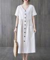Keten Günlük Rahat V Yaka Beli Büzgü Detaylı Düğmeli Elbise