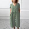 Keten Günlük Yazlık V yaka Kısa Kol Düğme Detaylı Kadın Elbise
