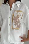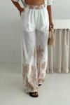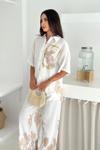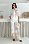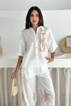 Keten Kumas Palmiye Baskılı Cep Taş Detaylı Takım Krem