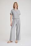 Barbora Keten Zarif Kadin T-shirt ve Uzun Pantolon Alt Üst İkili Takım V Yaka Kısa Kollu Salaş Rahat Gri Elbise