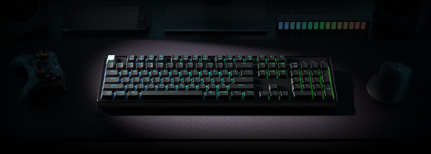 Kuzeye bakan RGB LED Işıklar22+ arka ışık modundan birini seçin ve ton, doygunluk, parlaklık ve efekt hızlarını Keychron Launcher web uygulaması içinde ayarlayın. Tarzınızı eşleştirin ve size özgü bir atmosfer yaratın.