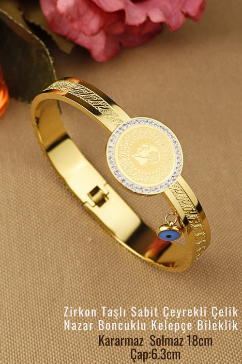 Kendinden Çeyrekli Çelik Kelepçe - Sabit Çeyrekli Nazar Boncuklu Zirkon Taşlı Çelik Bileklik Bileğinizden düşmeyecek Altın Parlaklığında Çelik Bileklik.