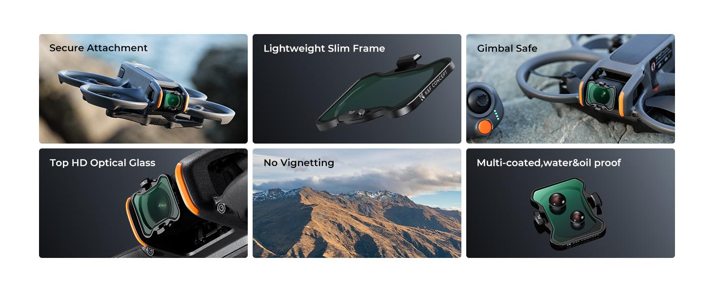 - K&F Concept ultra hafif teknolojisi, her filtre çerçevesinin drone gimbalinizi olumsuz etkilemeden sıkı bir testten geçmesini sağlar ve yalnızca 1,2 gram ağırlığındadır.