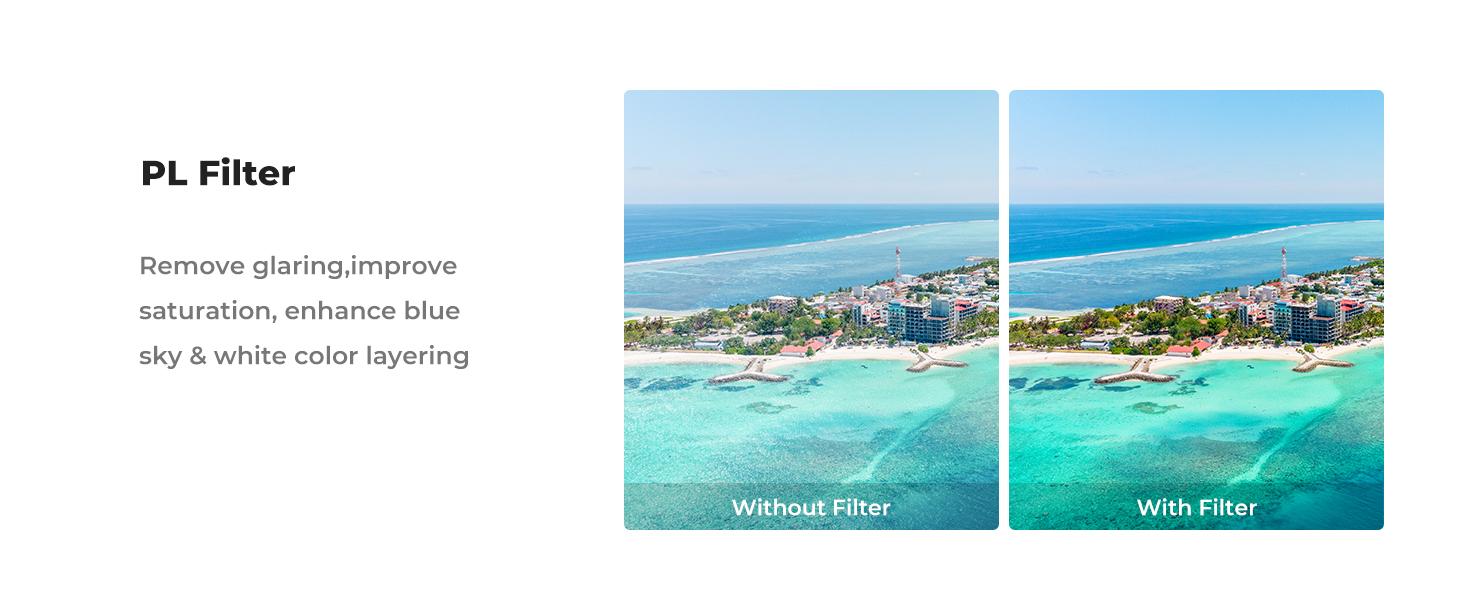 - DJI Avata 2 için PL Filtresi, su ve cam gibi metal olmayan yüzeylerden gelen istenmeyen yansımaları ortadan kaldırır ve büyüleyici fotoğraflar için renk ve kontrastı artırır. Yansımaları azaltarak ve renkleri geliştirerek çarpıcı görüntüler yakalayın.