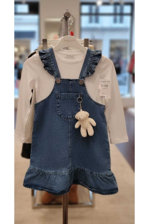 - Yumuşak kot kumaştan üretilmiş, çocukların rahatça hareket edebileceği diz boyu salopet elbise.