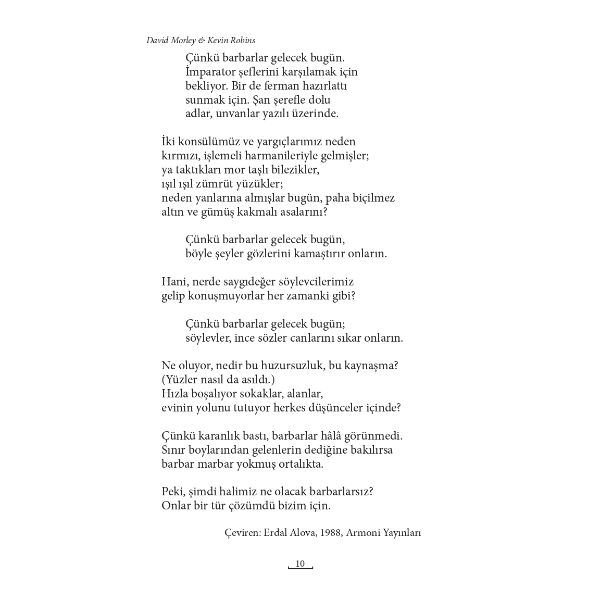 Yaşadığımız kaosun ilk belirtileri, 70'li yıllarda, nicelleşme ve metalaşmanın karakterize ettiği modern kültürün derinliklerinden beslenerek Batı Avrupa'daki politik sistemlerde "meşruluk krizi"ne dönüşmüştü. Tarihin tuhaf bir ironisiyle, tam Batı Avrupa entellektüel dünyası bu krizle baş etmenin yollarını ararken, Doğu Bloku içi geçmiş temsili demokrasinin ve meta dünyasının vaatleri peşinde koşan kitleler tarafından berdava edilince, önceleri pek kulak asmadığımız ne kadar sorun varsa hepsi birbirinin peşi sıra sökün etti: Ulusal ve budunsal kimlikler, ulus-ötesi şirketlerin damgasını taşıyan küresel kapitalizm, bölgesel hegemonya mücadeleleri, mikro milliyetçilik, ırkçılık ve bunların hem iktisadi hem de simgesel tepişme uzamlarının en başında gelen yeni iletişim teknolojileri.D. Morley ve K. Robins, tarihin bir değil birçok, kollektif ve bireysel kimliklerin dikişsiz değil çelişkili ve kırılgan olduğunun görülmeye başlandığı, ulus-devlet şemsiyesinin komünizm tarafından değil bizzat kapitalizm tarafından delindiği günümüz dünyasında öne çıkan bu sorunları enine boyuna inceliyorlar. Avrupa kültüründe temel bir sorun olduğunu, kendi olumluluğunu Avrupalı olmayanın olumsuzluğuna dayandırarak kendi kendisiyle özdeşleşmesinin narsist bir kimliğe dönüştüğünü ve artık kendini yeniden inşa etmek için geri çekilmeye başladığını söyleyerek şöylesi soruların peşine düşüyorlar: Demir Perde'nin eşanlı olarak böldüğü ve birleştirdiği Avrupa'nın coğrafi sınırları böyle net sınırların olmadığı bir ortamda nerede başlayıp nerede bitecektir? Bir yandan kitle iletişim araçları yoluyla Avrupalılık bilinci yeşertilmeye çalışırken öbür yandan sınır tanımayan iletişim biçimlerinden aldığı destekle Avrupa'yı hiçleyen Amerikanlaşma tehlikesi nasıl bertaraf edilecektir? Beyaz adamın sihri olan teknolojiyi eline geçirerek Batı'ya karşı yarma harekâtına girişen dünün modern öncesi ve ilkel Doğu'sunda yer alan sarı adamlar yerleşik uluslararası iktidar hiyeraşisinde nereye oturtulacaktır? Avrupa'nın belki 1492'den itibaren netleştirdiği ve o tarihten bu yana dünyanın her yanına ihraç ettği kozmopolit evrenselcilik ile dar görüşlü ve taşralı bölgecilik arasında halat çekme oyununda artan gerilimlerin üzerine boşaltılacağı yeni şeytan adayları (İslam, Doğu, Japonya, Amerika) bu oyunu boşa çıkarmak için hangi imkânlara sahiptir ve hangi ihtimallere oynayabilirler?...Yaklaşık 200 yıldır Batı'ya her adım atılışında Batı'nın biraz daha uzağına düşüldüğünün acıyla fark edildiği, içerideki Ötekilerden başını alıp da dışarıya hâlâ benzeri soruların daha bir acilleştiğini düşünüyoruz. Bir ülkenin "büyük rüya"lar görmeyi çok sevmesine rağmen sonunda, kendi, "iç düşman"larıyla ve sınır komşularıyla baş başa kalmasının nedenlerini biraz da kültür ve simge dünyasının sunduğu teorik ve politik kerterizden incelemek gerektiğini düşünüyorsanız, bu kitapta aradığınızdan daha fazlasını bulacağınıza emin olabilirsiniz.
