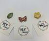 - El yapımı üçlü seramik charm seti; yaprak, kelebek ve çiçek figürlerinden oluşur.
