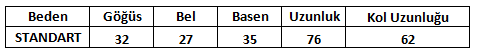 Ürün Beden Tabosu: