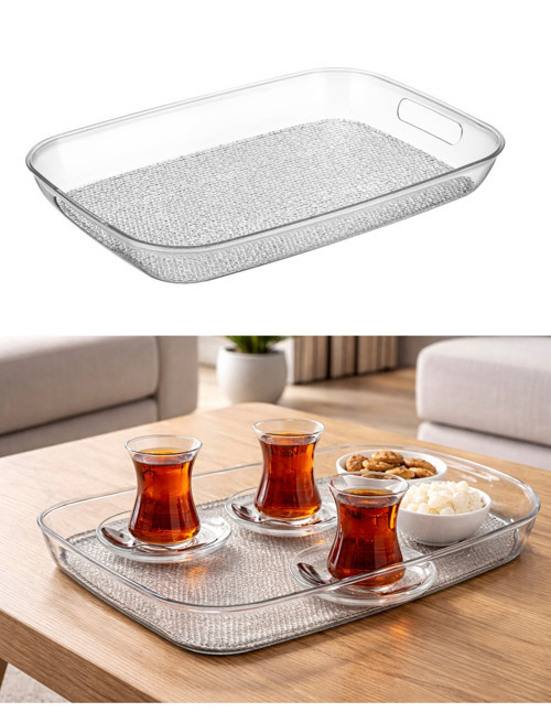 Kırılmaz akrilik malzemeden üretilmiş olan bu servis tepsisi, uzun ömürlü ve güvenli kullanım sağlar. Hafif yapısı sayesinde kolay taşınır, ergonomik tasarımı ile pratik bir kullanım sunar. Ev, ofis, mutfak ve salon kullanımı için uygundur.