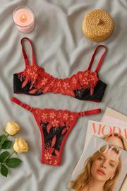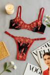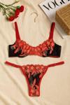 - Zarif kırmızı çiçek işlemeleriyle süslenmiş, feminen bir tasarıma sahip transparan dantel sütyen külot takımı.; - Askılı yapısı ile rahatlık sunarken, balensiz tasarımı sayesinde konforlu bir kullanım sağlar.; - Bralette üst silueti ile modern ve şık bir görünüm kazandırırken, tanga alt silueti minimal ve estetik bir uyum oluşturur.; - %90 polyester ve %10 elastan karışımından oluşan kumaşı esneklik ve dayanıklılık sunar; hareket özgürlüğünüzü kısıtlamaz.; - Çiçek desenleriyle göz alıcı bir stil vurgusu yaparken, her mevsime uygun kullanıma sahiptir.; - Kol boyu askılı tasarım, yaz aylarında serinlik hissi verirken, gece dış giyiminize şık bir tamamlayıcı olabilir.; - Çıtçıt kapama şekli pratik kullanım imkanı tanırken, dantel dokuması sofistike bir dokunuş katmaktadır.; - Maksimum 30 derecede elde yıkama önerisiyle kolay bakım avantajına sahip olan bu iç giyim seti, uzun süreli kullanım için idealdir.; - Esnek yapısıyla vücut hatlarınıza mükemmel uyum sağlayarak gün boyu rahat etmenizi garanti eder.; - İç giyim koleksiyonunuzda yerini alacak bu 2'li takım, hem günlük kullanım hem de özel anlarınız için idealdir.