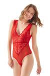 Kırmızı Dantelli Çıtçıtlı Dekolteli Tül Detaylı Kadın Bodysuit