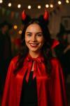 Kırmızı pelerinin zarif duruşu ve şeytan tacının ışıltısı, tarzınıza gizemli bir hava katar.