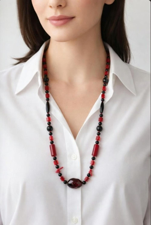 Kırmızı & Siyah Doğal Taş Uzun Kolye, güçlü renk kontrastı ve zarif tasarımıyla stilinizi anında öne çıkarır. Kırmızı ve siyah tonlarının etkileyici uyumu, bu kolyeye hem gizemli hem de sofistike bir hava kazandırır.