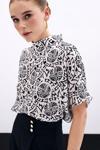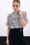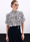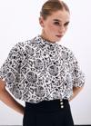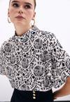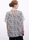 Dik yaka, geniş kısa kol, arka yaka düğmeli, desenli uzun bluz.