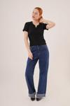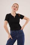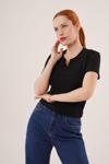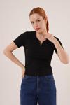 Kısa Kollu Yaka Detaylı Kaşkorse Siyah Bluz