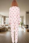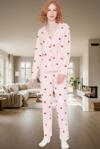 Premium kaliteli örme kumaşı ve süprem dokuma tipi ile uzun yıllar boyunca kullanabileceğiniz bu pijama takımının dayanıklılığı sizi etkileyecektir. Metraj baskı tekniği ile uygulanan kalp desenleri, canlı renkleriyle uzun süre solmadan kalıcılığını korur. Normal bel kısmı ile konforlu bir kullanım sunarken, basic silueti her vücut tipine uygundur. Gömlek yakası ve boru paça detaylarıyla şıklığı ve rahatlığı bir araya getirir. Evde rahatlamak ve kaliteli bir uyku geçirmek için mükemmel bir seçimdir.