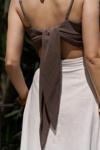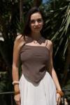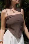 Ayarlanabilir askılı, çift katlı, üçgen keten karışımlı transparan crop.