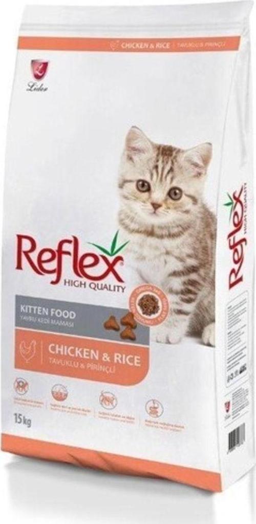 Reflex kitten yavru kedi maması 15 kg hayvansal protein kaynağı olarak tavuk unu kullanılarak üretilmiş yavru kedi mamasıdır.