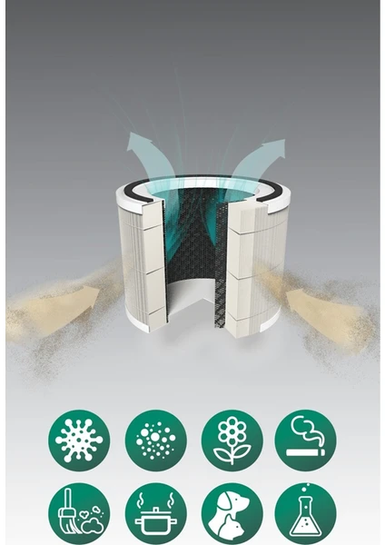 Havadaki 2,5 mikron boyutuna kadar tüm zararlı partikülleri ve kirleticileri %99,97'ye kadar yok eder.