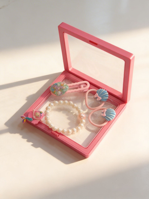 Şık pembe saklama kutusu içerisinde sunulan bu set; deniz kabuğu figürlü lastik tokalar, deniz kızı detaylı tokalar ve inci görünümlü bileklik ile zengin bir kombin sunar. Günlük kullanımda saçları nazikçe toplarken aynı zamanda zarif ve dikkat çekici bir görünüm sağlar.