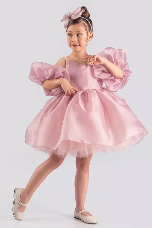 Kız Çocuk Balon Kollu Eteği KatKat Fırfırlı İçi Astarlı Somon Abiye - Image 1