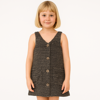 Zamansız tasarımı ve dokulu kumaşıyla öne çıkan bu kız çocuk askılı elbise, hem sade hem sofistike bir görünüm sunar. V yaka kesimi, ön kısmındaki düğme detayları ve iki fonksiyonel cep ile hem şıklık hem pratiklik sağlar. Dokulu, tweed görünümlü kumaşı sayesinde özel günlerde ya da günlük kombinlerde rahatlıkla tercih edilebilir. İçine tişört veya bluz ile kolayca kombinlenebilir. 1–5 yaş arası beden seçenekleriyle sunulur.
