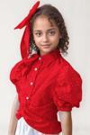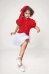 Riccotarz Kız Çocuk Balon Kol Üzeri Boydan Taş İşleme Asimetrik Kesim Kırmızı Gömlek Çiçek Motif Etekli Takım