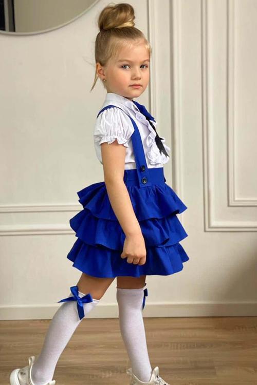 Kız Çocuk Balon Kollu Yakası Fırfırlı Gömlek Kat Kat Fırfırlı Mavi Etekli Salopet Takım