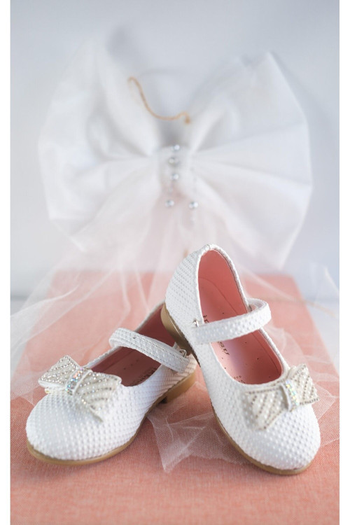 Kız Çocuk Beyaz Pıtırlı Fiyonk Detaylı Cırtcırtlı Babet