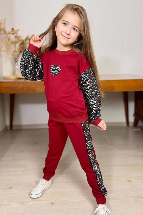 Kız Çocuk Bisiklet Yaka Kollarında ve Göğsünde Kalp Pulpayet İşlemeli Kırmızı Eşofman Takım