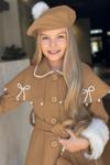 Kız Çocuk Boydan Yakası İnci Taş İşlemeli Şal Detaylı Kemerli Bej Kaşe