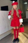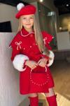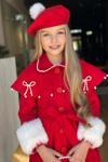 Kız Çocuk Boydan Yakası İnci Taş İşlemeli Şal Detaylı Kemerli Kırmızı Kaşe