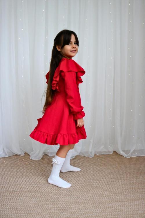 Kız Çocuk Catherine Kırmızı Fiyonklu Fırfırlı Uzun Kol Keten Elbise