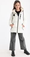 Kız Çocuk Yakası Şerit ve Üzeri Kare Dikiş Detaylı Cepli Çıtçıt Düğme Şişme Krem Mont - Image 1