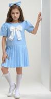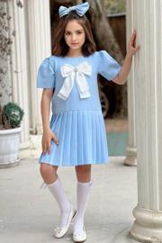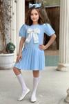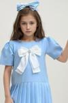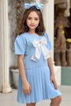 Kız Çocuk Göğsü Fiyonk Detaylı Eteği Pliseli Mavi Elbise