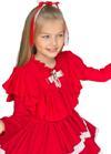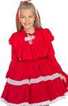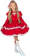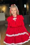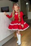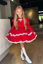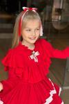 Kız Çocuk Göğsü ve Yakası Fırfırlı Eteği Pliseli Dantel Şerit Detaylı Kırmızı Elbise