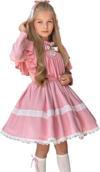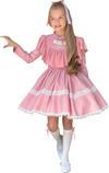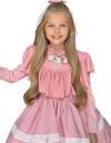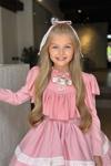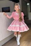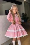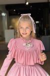 Kız Çocuk Göğsü ve Yakası Fırfırlı Eteği Pliseli Dantel Şerit Detaylı Pudra Elbise