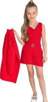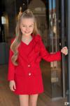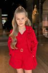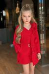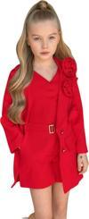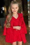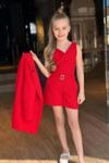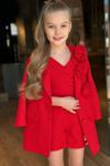 Kız Çocuk Gold Düğmeli ve Gül Broşlu Blazer Ceket Askılı Penye Bluz Kırmızı Şortlu Takım