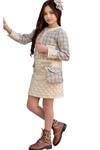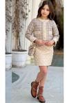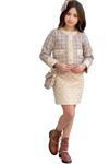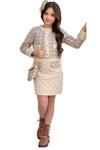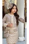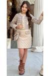 Kız Çocuk Gold Şerit ve Kapitone Detaylı Şanel Kumaş Bej Etekli Takım