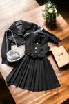 Ürün bilgisi: %80 pamuklu, gömlek yaka önü düğme detaylı arkası fermuarlı kemerli siyah elbise.