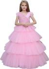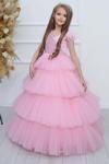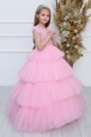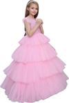 Kız Çocuk Gövdesi İnci Taş İşlemeli Kat Kat Tüllü Kolsuz Pembe Abiye