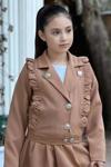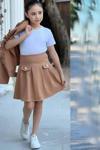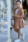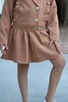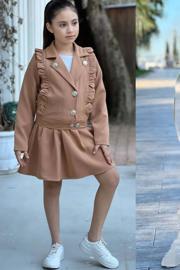 Kız Çocuk Gümüş Düğme ve Fırfır Detaylı Kahverengi Ceket Etekli Takım