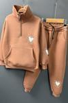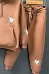 Kız Çocuk Kalp Emoji Baskılı Kanguru Cepli Fermuarlı Sweat Taba Eşofman Takım